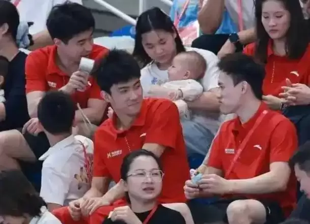 那时候她不再是焦点选手,而是变成了啦啦队,给广东队的队友加油,给中国跳水队助威,期间她还帮队友抱孩子、逗小孩玩,跟周围的观众互动。