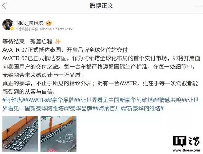 阿维塔品牌全球化进程迈出关键一步。近日,阿维塔海外营销高级总监通过社交平台宣布,右舵版阿维塔07(AVATR 07)已正式运抵泰国,标志着该品牌在东南亚市场的首次交付正式启动。这一动作被视为阿维塔加速布局海外市场的重要里程碑。