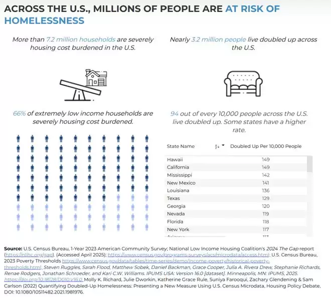 这个住户包括单人和多人的,美国人口普查局公布的2024年美国住户(household)平均大约是2.49人,720万乘以2.49就是大约1800万人了, 这一千多万人里面有几百万有可能沦为homeless的风险也正常。