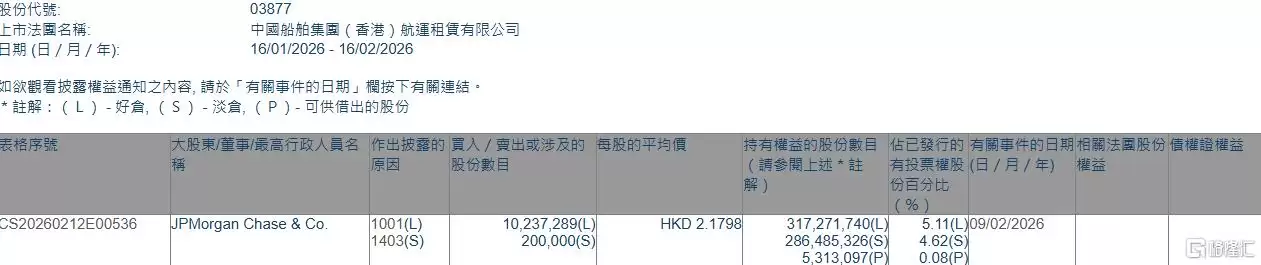 根据联交所最新披露的权益资料显示,2026年2月9日,中国船舶租赁(03877.HK)获得摩根大通以每股均价2.1798港元增持1023.73万股,涉及资金约2231.52万港元。