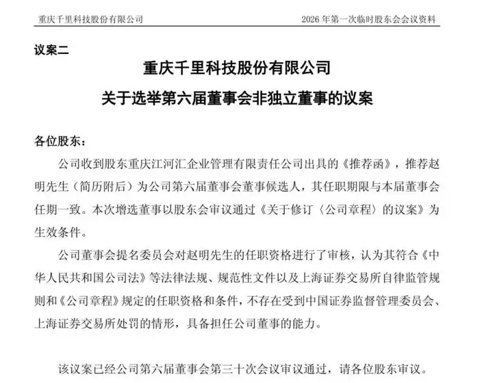 2月12日,千里科技(601777.SH)发布公告称。公司第六届董事会第三十次会议审议通过了《关于修订<公司章程>的议案》,增设联席董事长一名,以及《关于选举第六届董事会非独立董事的议案》,同意提名赵明为公司第六届董事会非独立董事候选人。