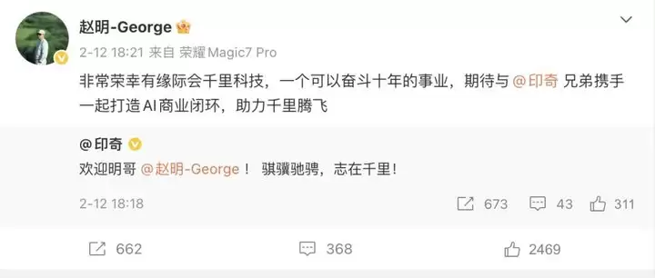 随后,赵明回应印奇微博称:非常荣幸有缘际会千里科技,一个可以奋斗十年的事业,期待与印奇兄弟携手一起打造 AI 商业闭环,助力千里腾飞。