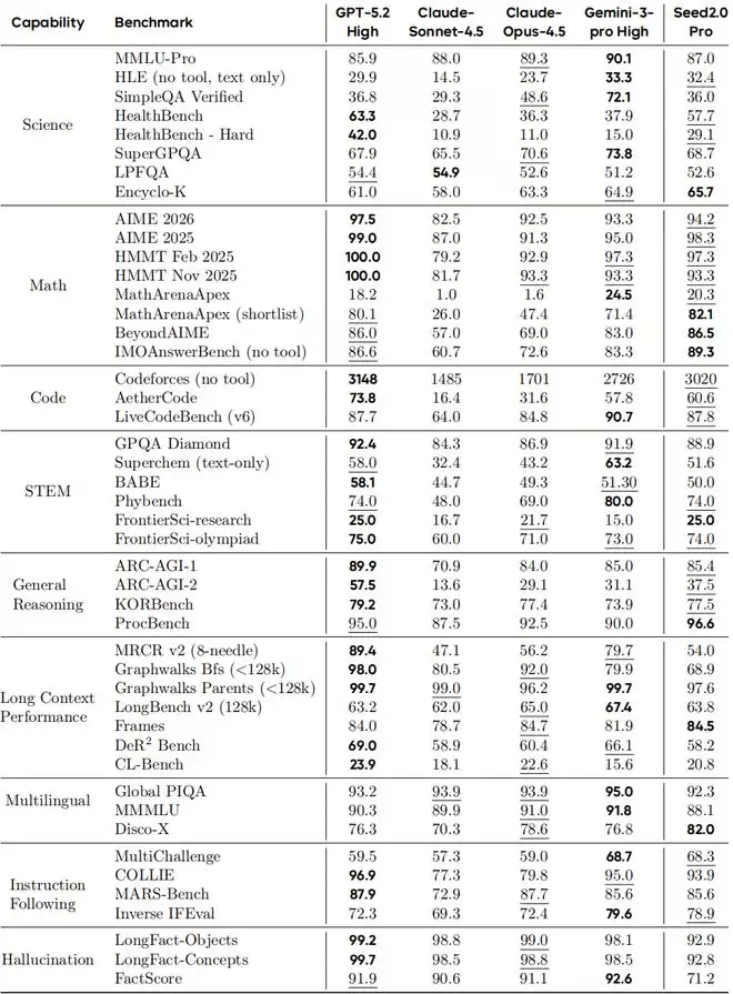 综合来看,Seed2.0 Pro在核心语言能力上与GPT-5.2和Gemini-3-Pro同属第一梯队。长文本理解和中文场景理解是其绝对优势区,在数学推理、代码生成和通用知识上,与国际顶尖模型互有胜负,在部分重度依赖检索的任务上,仍有优化空间。
