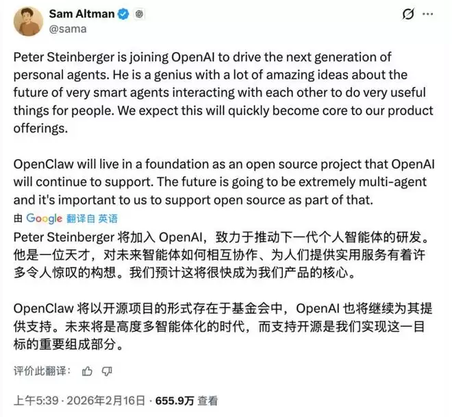 他在消息中明确表示:“OpenClaw将继续以开源项目形式存在,OpenAI也会继续为其提供支持。”