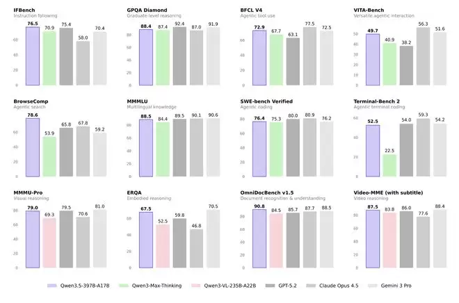 在性能表现方面,Qwen3.5在MMLU-Pro知识推理评测中获得87.8分,超越GPT-5.2;在博士级难题GPQA测评中取得88.4分的优异成绩,优于Claude 4.5;在指令遵循IFBench测试中以76.5分刷新纪录。其视觉能力同样显著提升,在MathVison、RealWorldQA、CC_OCR、RefCOCO-avg、MLVU等多模态评测中均位列榜首。