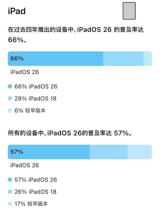在所有的设备中,iPadOS 26的普及率达 57%,还有26%运行iPadOS 18、17%运行较早版本。