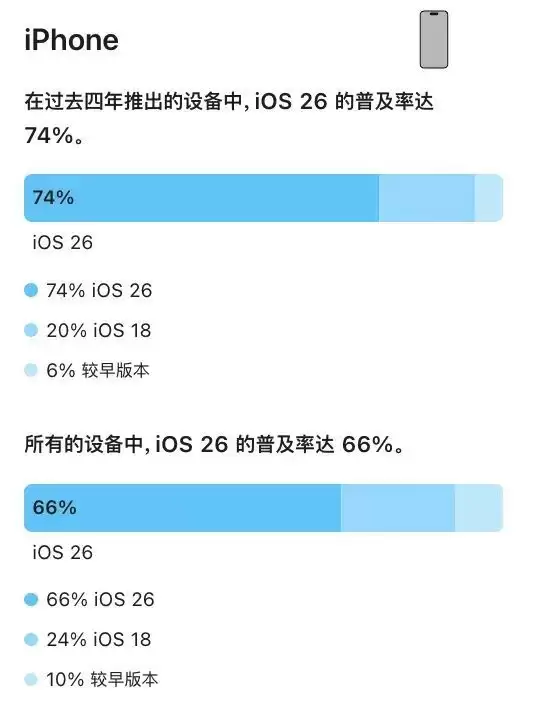最新数据显示,在过去四年中推出的全部 iPhone 中,有 74% 的设备运行的是 iOS 26 系统,20%运行的是iOS 18,6%运行的还是较早版本。