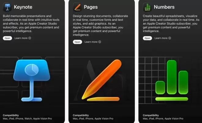 这三款软件,页面上不仅有每款软件的相关信息,还附有链接。如今的“Apple Apps”网页在“生产力”板块也提供了类似信息,同时加入了 Creator Studio 相关的推广内容。