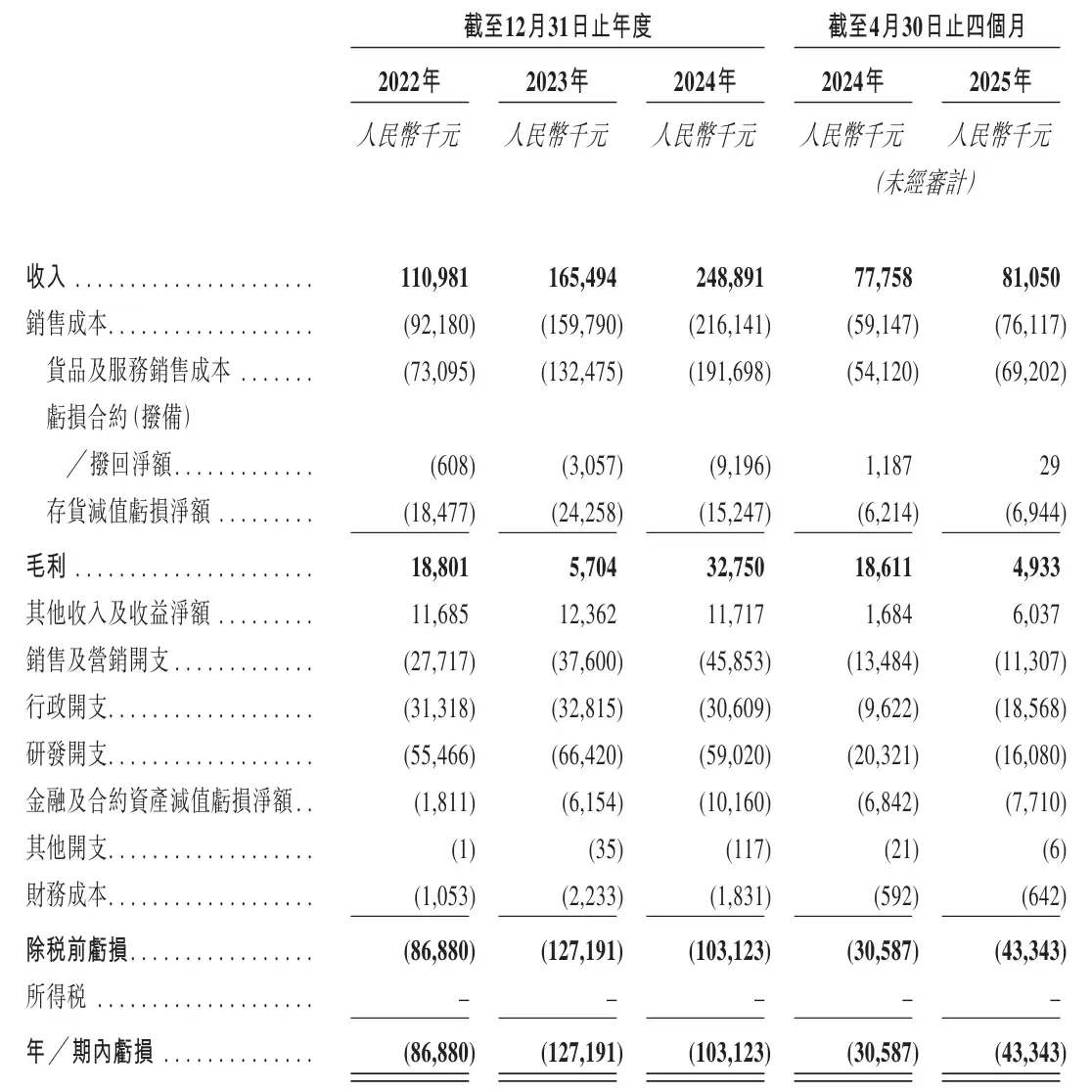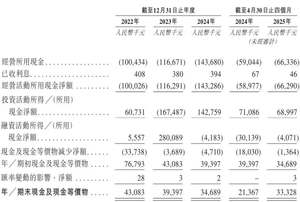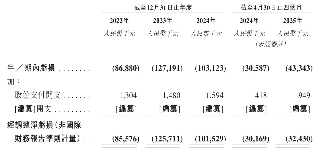 若按经调整净亏损口径计算,哥瑞利2022年、2023年及2024年的数据分别为8558万元、1.26亿元和1亿元。2025年前四个月的经调整净亏损为3243万元。