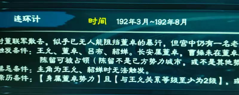 接着,前往董卓所在的城池担任官职即可。完成事件后,再去找董卓辞官(连环计任务做完就可以直接下野了,此时董卓王允已死,吕布的好感度会直接下降),回到你原本的城池,进入官府。如果你此时是君主身份,便可以继续行使君主的权力。