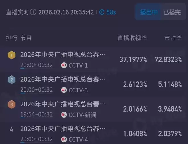 开场半个多小时,马年春晚收视突破37%,进入关键时刻,决定着能否超越往届春晚收视。