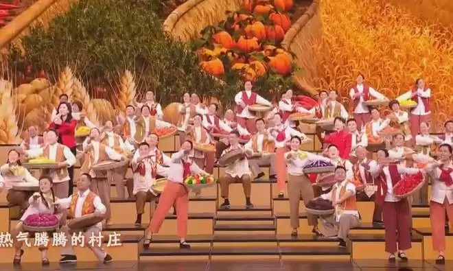 在机器人、ai、短视频的包围之下,21:14左右,《来晒秋》来了,凤凰传奇上了12次春晚了,但《来晒秋》最先出场的不是玲花、曾毅,而是农民合唱团的叔叔阿姨们。