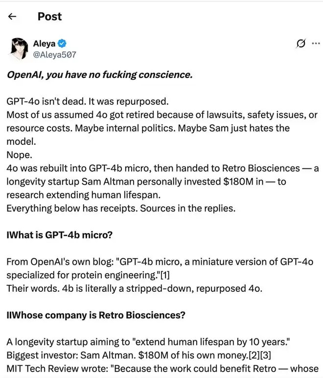 在这片愁云惨雾之中,一条来自 X 平台用户的长帖迅速传播开来,标题语气极为激烈:“OpenAI,你没有良心。”帖子的核心论点是:GPT-4o 并没有真正死去,而是被“重建”为 GPT-4b micro,然后被交给了一家名为 Retro Biosciences 的长寿科技创业公司,而这家公司的最大投资人,恰恰是 OpenAI 的 CEO 萨姆·奥特曼(Sam Altman)本人,他个人向 Retro 注入了 1.8 亿美元。帖子的逻辑链条是这样的:奥特曼用 OpenAI 的核心模型、算力和团队,为自己私人投资的公司服务,而那家公司的目标是“将人类寿命延长十年”。换言之,4o 被从普通用户手里夺走,是为了给 CEO 和富豪们续命。
