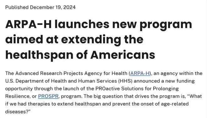 ARPA-H 表示,它计划与全国多个研究组合作,通过临床试验和 AI 驱动的数据集分析,找到可靠的生物时钟。并通过更快、更具成本效益的方法在人类中测试可能延缓衰老的干预措施,帮助长寿产业开发可量产的延缓衰老疗法。