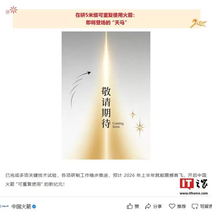 我们注意到,还有一批“天马”即将登场——我国在研的5米级可重复使用火箭已完成多项关键技术试验,各项研制工作稳步推进,预计2026年上半年就能实现首飞。最新表态表明,它将开启中国火箭“可重复使用”的新纪元。
