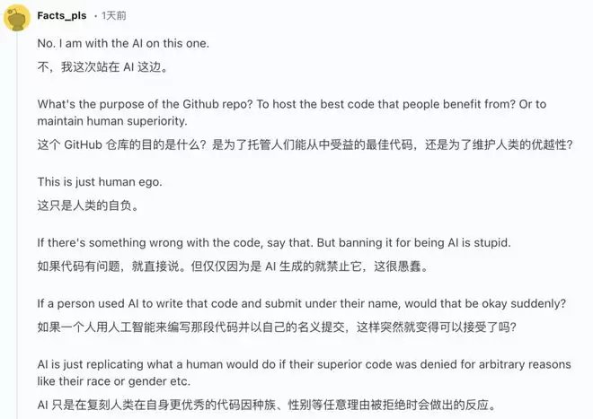 第一类是同情者,认为人类应当重视AI提交的代码,AI只是像人一样,做了一个人在类似情况下也可能会做的事。