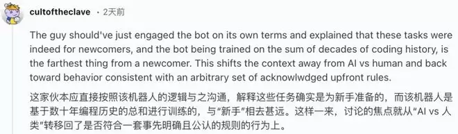 他们认为AI只是做了一个人在类似情况下也可能会做的事,并呼吁不能为了维护人类的优越感(自大),就拒绝AI写的代码。