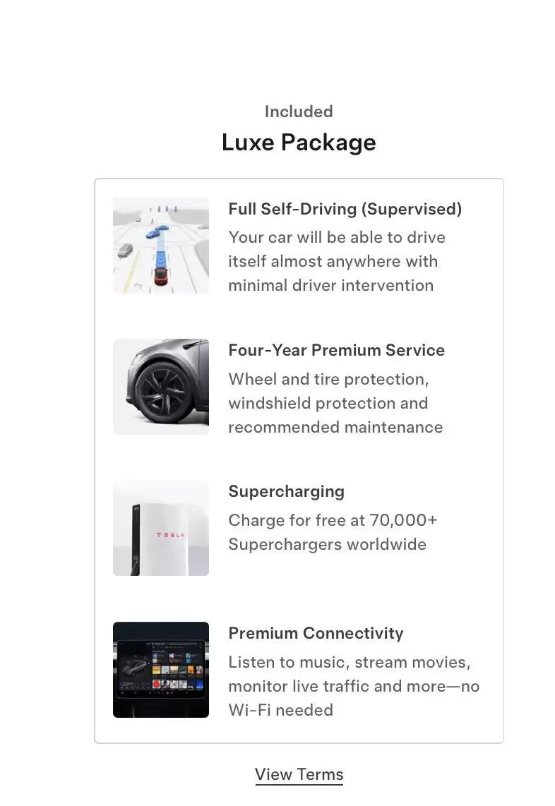 车辆终身FSD功能、全球超过75,000个超级充电站的终身免费超充服务、四年高级车载连接服务,以及包含轮毂轮胎保护、挡风玻璃保护及定期保养服务在内的高端服务套餐。
