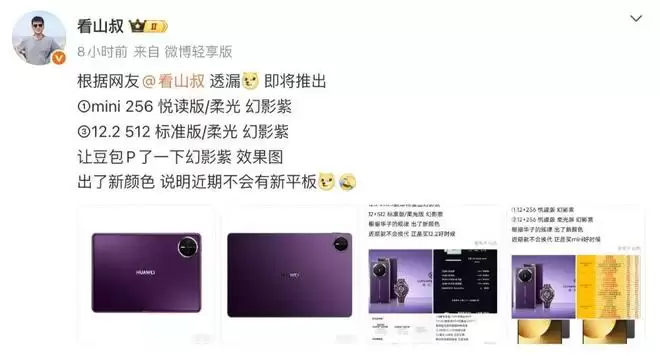 在此之前,这位博主也提到过,“MatePad Mini即将推出幻影紫①12+256 悦读版 幻影紫②12+256 悦读版 柔光屏 幻影紫”“MatePadPro 12.2 2025款即将推出幻影紫,12+512 标准版/柔光版 幻影紫”等信息。