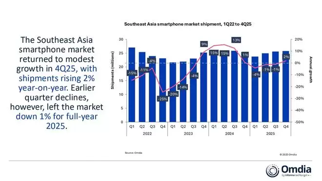 2月17日,专业调研机构Omdia在英国发布的报告表明,东南亚智能手机市场经历连续三个季度的下滑后,终于在2025年第四季度实现出货量同比增长2%,不过全年出货规模相较于2024年仍微降1%。