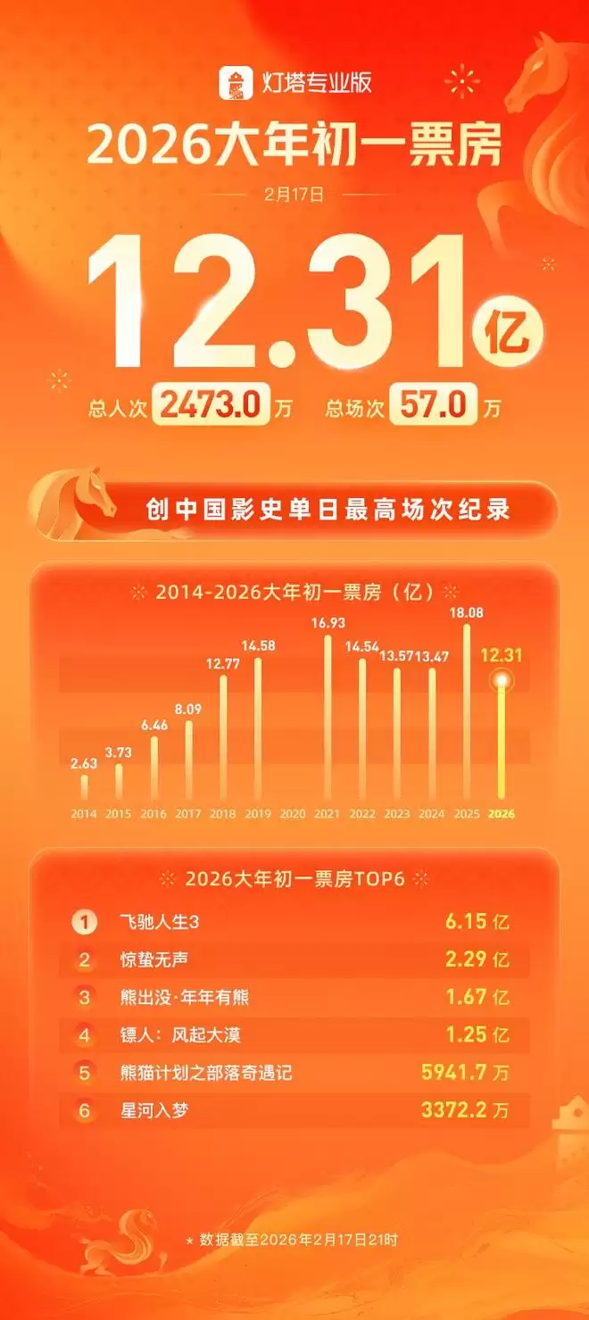 据大麦娱乐旗下灯塔专业版数据,截至2月17日21时,2026大年初一票房12.31亿元,到22时,春节档总票房已突破15亿元。仅《飞驰人生3》票房超6亿元,成为2026大年初一票房冠军。