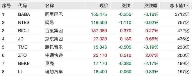 中概股涨跌互现,纳斯达克中国金龙指数微跌0.1%。热门中概股方面,中通快递涨超2%,腾讯音乐跌超3%,贝壳跌超2%,阿里巴巴、网易、理想汽车下跌,京东集团、百度集团等上涨。