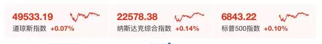 截至收盘,道琼斯工业平均指数微升0.07%,收报49533.19点;标普500指数上涨0.1%,报6843.22点;纳斯达克综合指数攀升0.14%,收于22578.38点。
