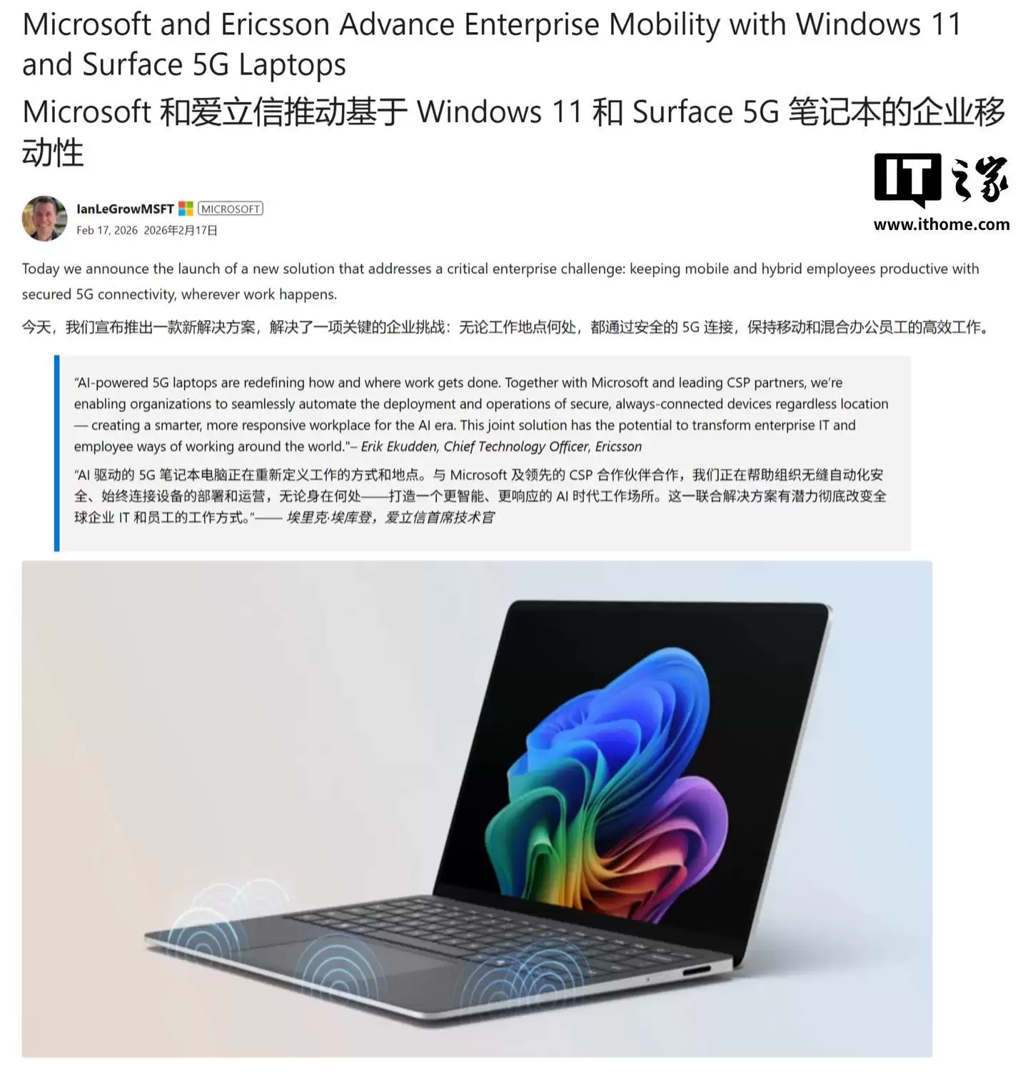 IT之家2月18日消息,微软于昨日(2月17日)发布公告,宣布与爱立信达成战略合作,共同推出面向企业的“Ericsson Enterprise 5G Connect”网络解决方案。该方案旨在破解移动办公场景下的网络连接难题,确保员工随时随地保持高效在线,首批适配设备已锁定微软旗下Surface系列个人电脑。