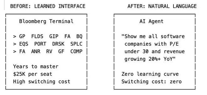 以前像彭博终端这种软件,最牛的护城河其实是「难用」,用户花了很长时间学会了那些复杂的快捷键和代码,学会了就不想换。但现在,LLM把所有复杂的界面都坍缩成了一个聊天框,用户只要会说人话就能调取数据、调模型,那个让华尔街为此买单的「熟练度壁垒」瞬间归零。