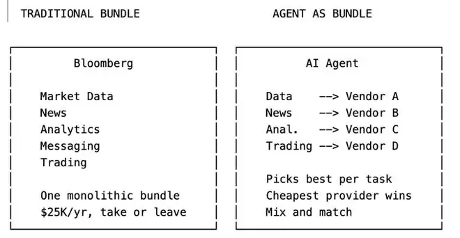 当集成层从软件供应商转移到AI智能体时,购买捆绑包的动力就蒸发了。当智能体可以为每种能力挑选最好(或最便宜)的提供商时,为什么要为整个套件支付彭博的溢价?