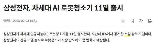 【CNMO科技动态】根据韩国媒体报道,三星电子将于2月11日正式推出其全新一代AI智能扫地机器人。据悉,这款产品名为“2026 Bespoke AI Steam Ultra”,是去年在IFA展会上首次亮相的“Bespoke AI Steam”系列的迭代升级款。目前,关于这款新一代AI清洁机器人的其他具体信息还非常有限。