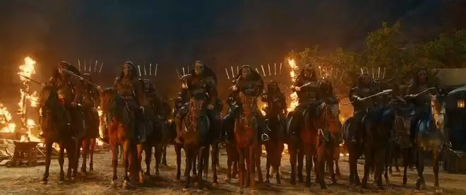 开场是大漠追逐战。十几匹马在黄沙里狂奔,演员在马背上挥刀格挡、翻身躲避,马蹄扬起的尘土和刀光交织在一起。这不是特效,是真马、真沙、真人在跑。