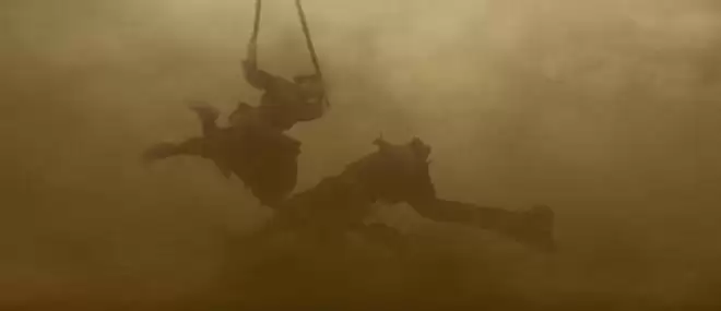 最令人震撼的一幕是沙尘暴中的决战。黄沙铺天盖地,能见度几乎为零,两个人在风沙里厮杀,镜头捕捉到的是沙尘翻滚形成的流动线条。