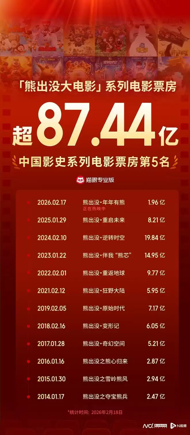 根据猫眼专业版数据显示,截至2月18日0时,《熊出没·年年有熊》累计票房已突破1.96亿元,助力熊出没系列电影总票房超越《流浪地球》系列电影的成绩,成功跻身中国影史系列电影票房榜前五名。