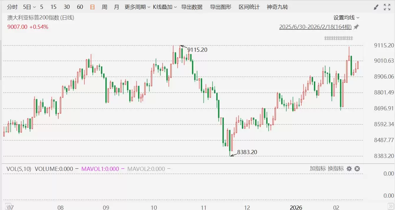 2月18日,澳大利亚S&P/ASX200指数收盘走高,上涨48.10点,涨幅0.54%,报收于9007.00点。