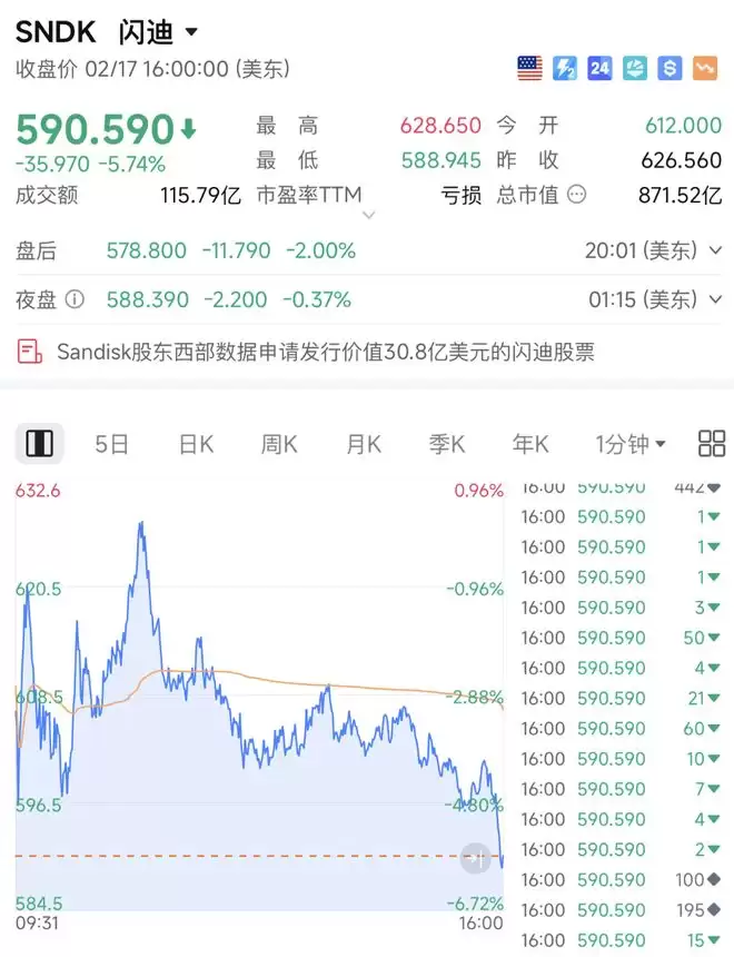 美东时间2月17日,美国存储芯片巨头—闪迪(SanDisk)股价大幅跳水,一度大跌6%,在美股盘后交易中,其股价继续走低,大跌2%。消息面上,西部数据宣布,将出售其所持有的闪迪全部普通股,交易规模约30.9亿美元(约合人民币213亿元)。这或是这家硬盘制造商在分拆一年后彻底退出前子公司的最后一步。