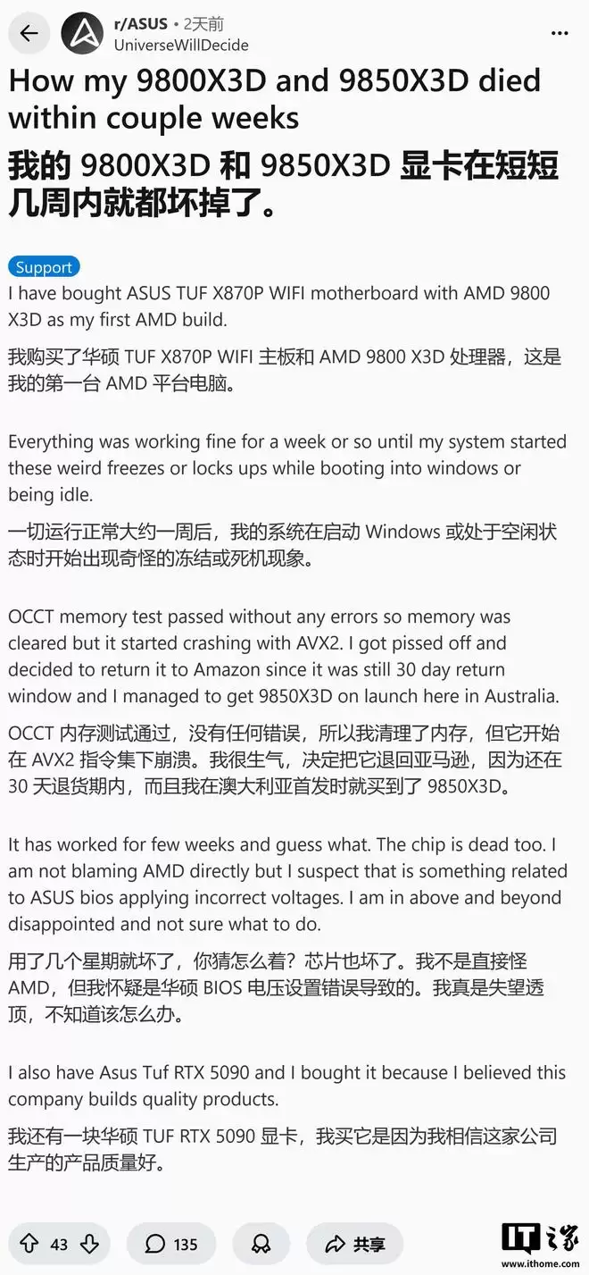 IT之家2月19日获悉,Reddit社区用户u/UniversewillDecide于2月17日发帖透露,其使用的AMD Ryzen 7 9850X3D处理器出现运行异常。科技媒体Wccftech指出,这是该型号处理器首次被公开报告的故障案例。
