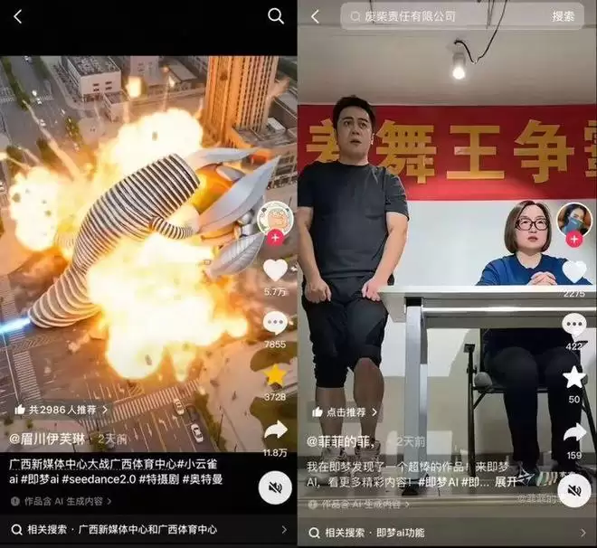 有两条AI视频作品让我个人感到相当震惊。一个是广西媒体中心大战广西体育中心,两栋建筑变身大怪兽,打出了一种哥斯拉大战蝎子莱莱的感觉。另一个是我经常会看的账号@废柴责任有限公司,他们在Seedance2.0的刺激下好像完全放飞了自我,让一位员工的AI分身穿着短裤参加了辣眼睛的娇羞舞王争霸赛。
