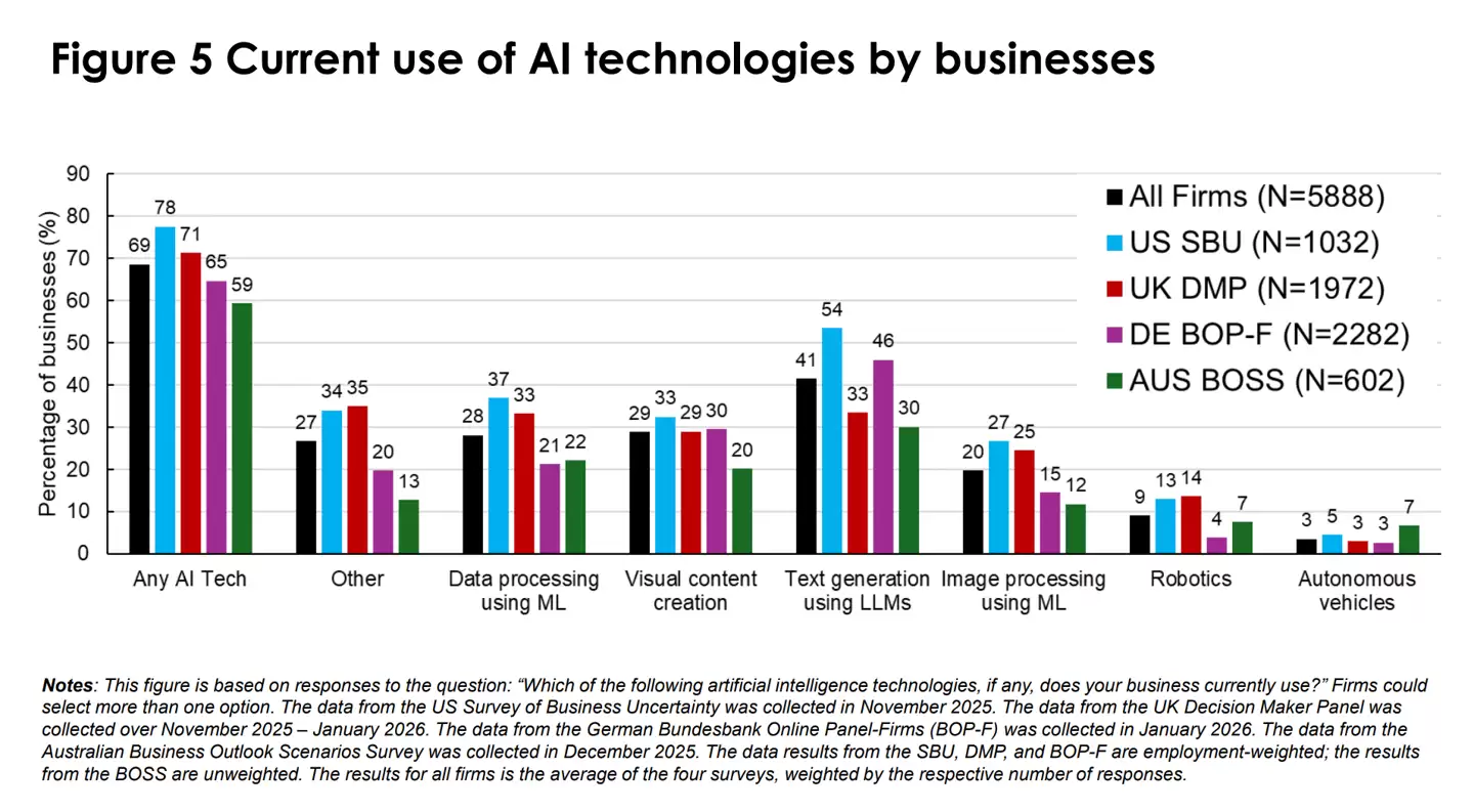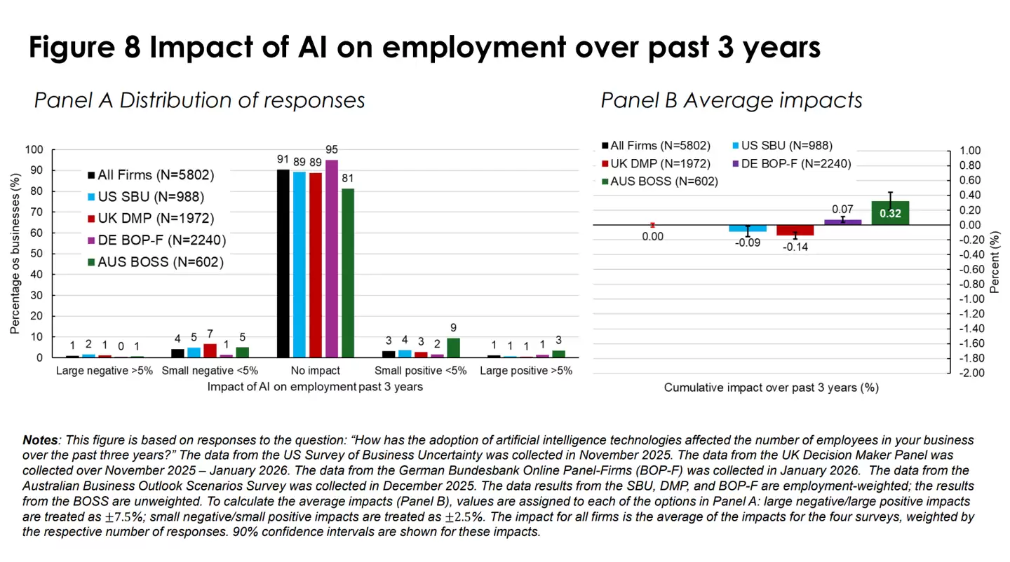 这项研究调查了来自美国、英国、德国和澳大利亚的六千多名首席执行官及高层管理者,结果显示,超过80%的企业认为,在过去三年里,人工智能对就业或生产力“没有产生实质性影响”。