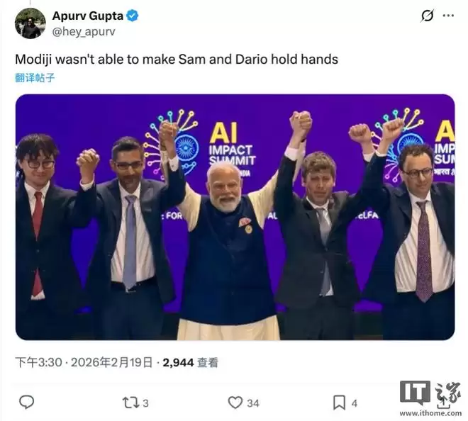 2月19日,IT资讯平台发布消息称,本周多位全球人工智能领域的领军人物齐聚印度新德里,原本讨论的是模型迭代与社会影响,却意外留下了一张科技圈令人难忘的“手牵手”合影。