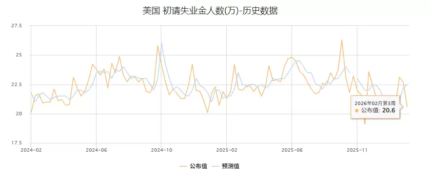 截至2月14日当周,美国首次申领失业金人数录得20.6万人,创下自1月10日当周以来的新低;市场预期为22.5万人,前值由22.7万人修正为22.9万人。