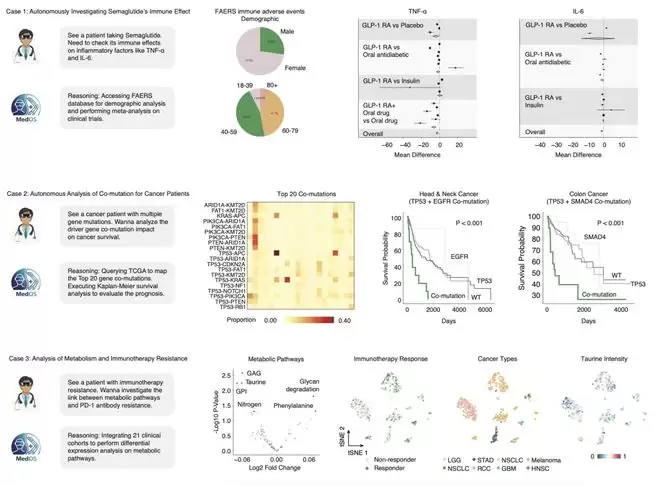 在演示中,它展现了自主临床发现(Autonomous Clinical Discovery)的能力。 面对复杂的癌症病例,MedOS能自主识别多基因突变,自动调用TCGA数据库挖掘共突变基因,并执行生存分析,生成详尽的预后报告。 它像一个24小时/7天不间断工作的医学博士后,在临床实践中不断挖掘新的医学知识。