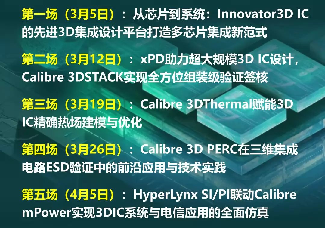 西门子EDA正积极布局赛道,重磅投入资源,致力于打造覆盖3D IC全流程的完善解决方案。自2026年3月5日起,西门子EDA将召开3D IC设计解决方案系列在线研讨会。诚邀业内同仁相约线上,一同交流分享,探索新技术版图,共抓产业发展新机遇。