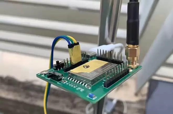 象芯三号进行桥上拉远测试,图为芯片测试板,使用射频馈线连接到支架顶部的天线。