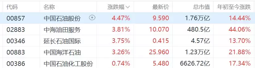 在国际油价持续攀升的背景下,港股石油股今日表现亮眼。其中,中国石油股份涨幅超过4%,中海油田服务、延长石油国际及中国海洋石油均录得超过3%的涨幅,创下历史新高。