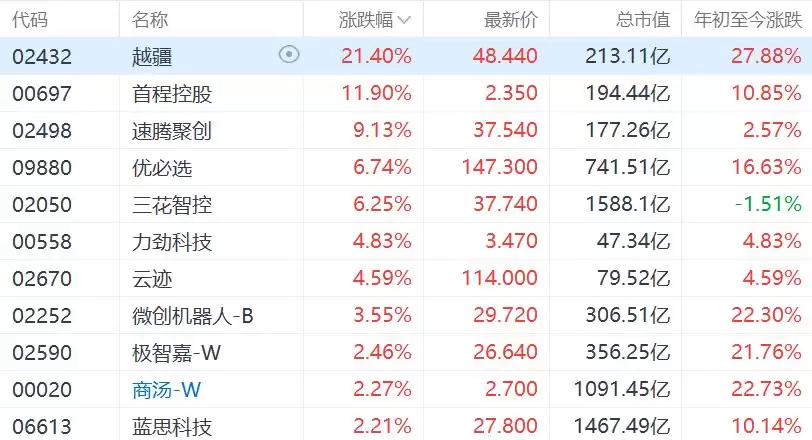 港股机器人概念股集体大涨,越疆科技涨幅超21%