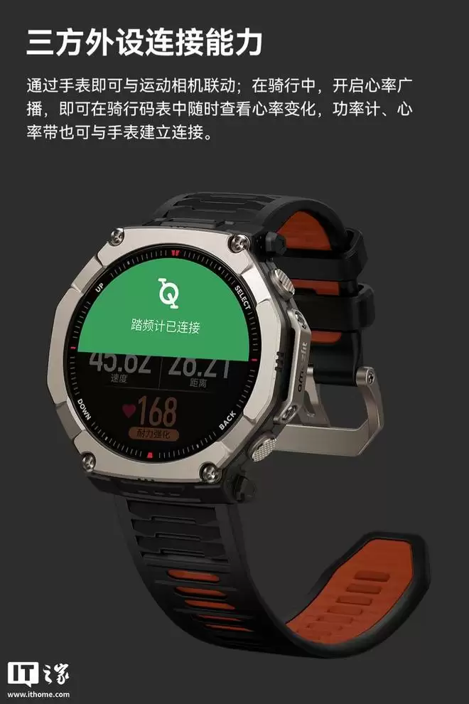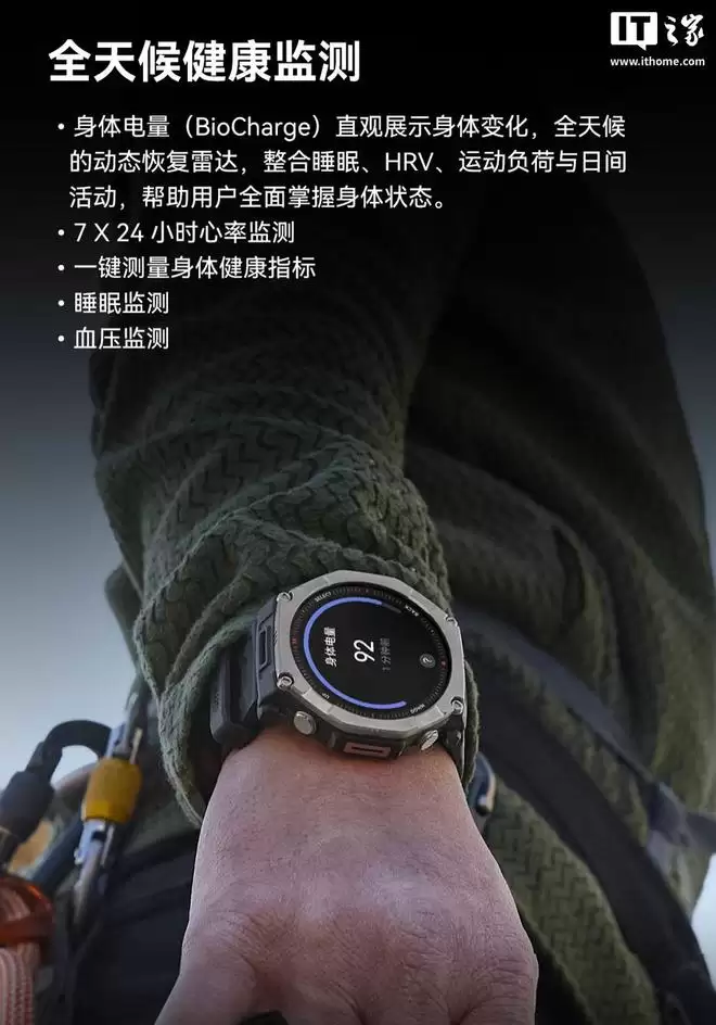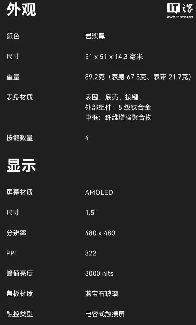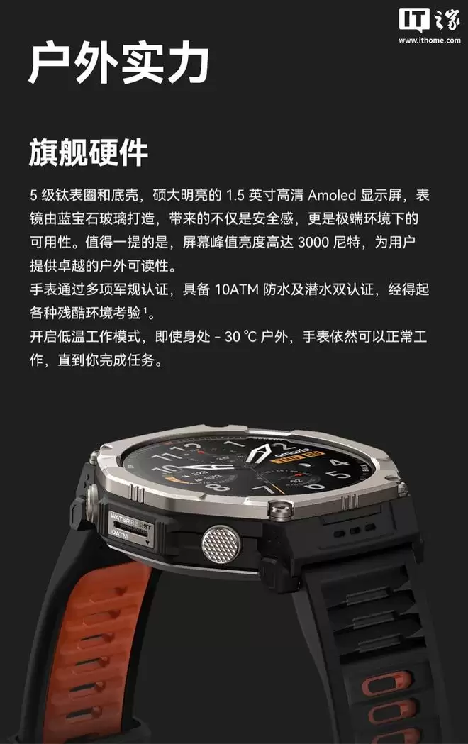 据介绍,这款手表搭载 1.5 英寸圆形 AMOLED 屏幕,峰值亮度可达 3000 尼特,覆盖蓝宝石玻璃,支持 10ATM 防水,可在零下 30 度的户外环境正常工作。