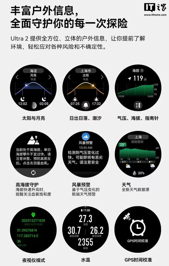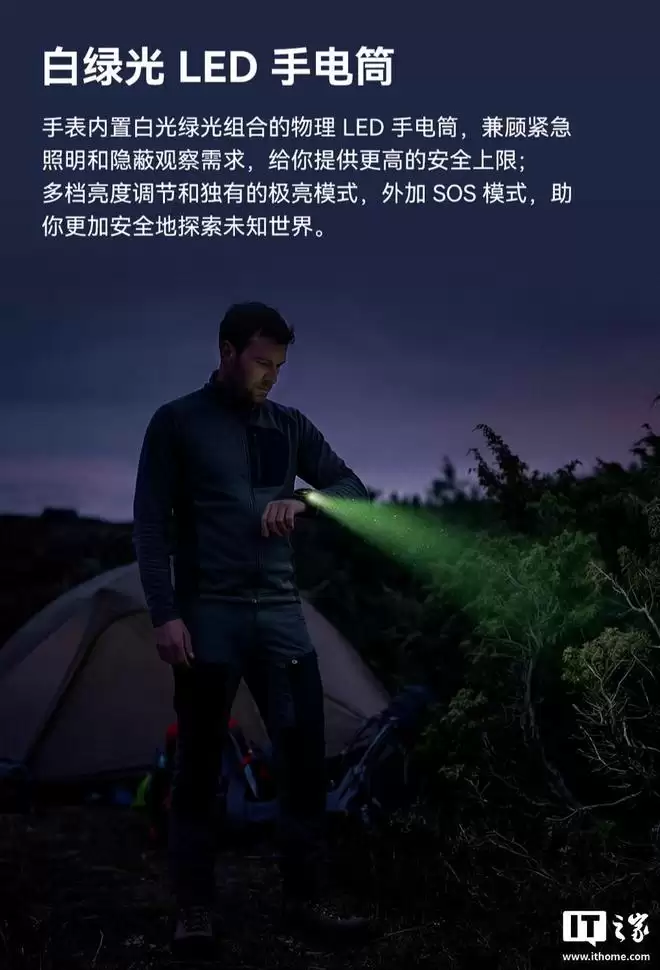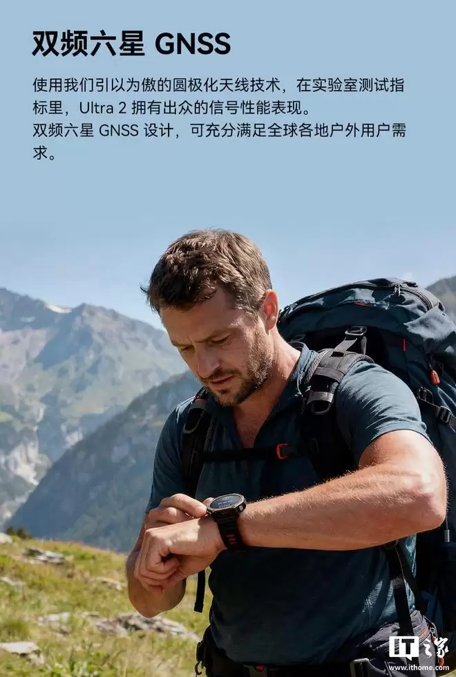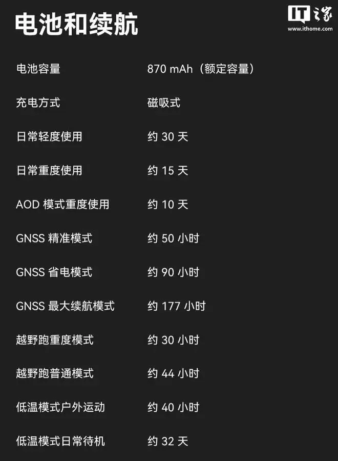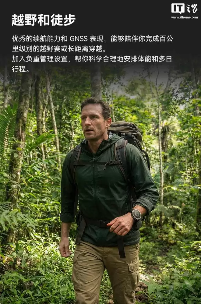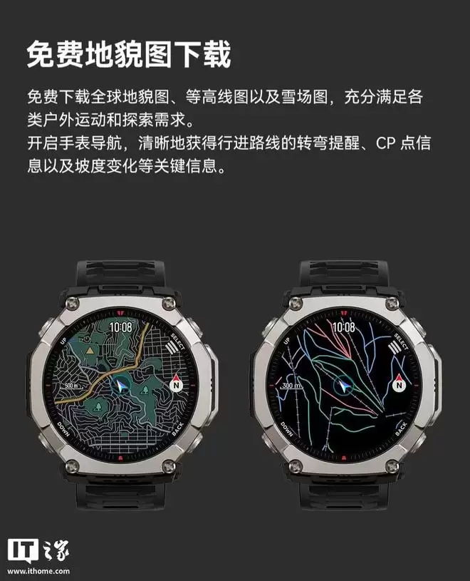 规格方面,这款手表内置 870mAh 电池,日常工作续航可达 30 天,搭载双频六星 GNSS 定位系统,具备免费地貌图,支持离线路径规划,不需要手机、网络就能够规划目的地路径、绕圈路线等。