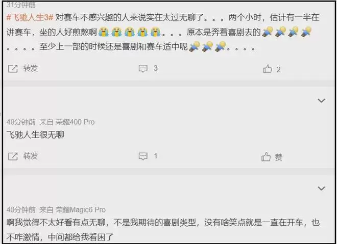 《飞驰人生》上了三次春节档,前两部都是典型式搭子电影,靠着假期红利吃肉喝汤,缺少话题度和戏外延伸,用最近流行的话说,《飞驰3》是一部“没年味”的电影,看过就算了,很无聊,带不起票房大盘。