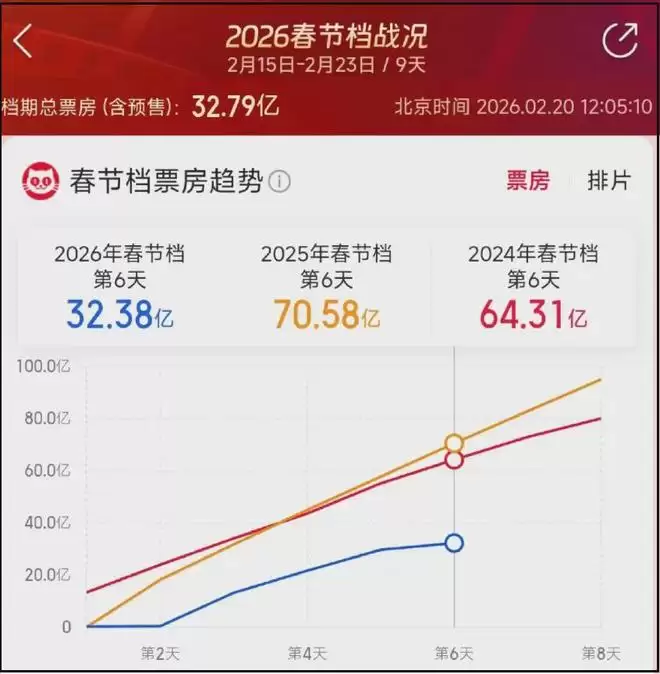 2026年春节假期最长,却成了近8年最冷春节档,目前2026年春节档8部电影全部上映,票房格局已定,不和2025年《哪吒》带热的大盘比,就看2024年贾玲“减肥片”夺冠那一年,2026年同期累计票房都差了几十亿。